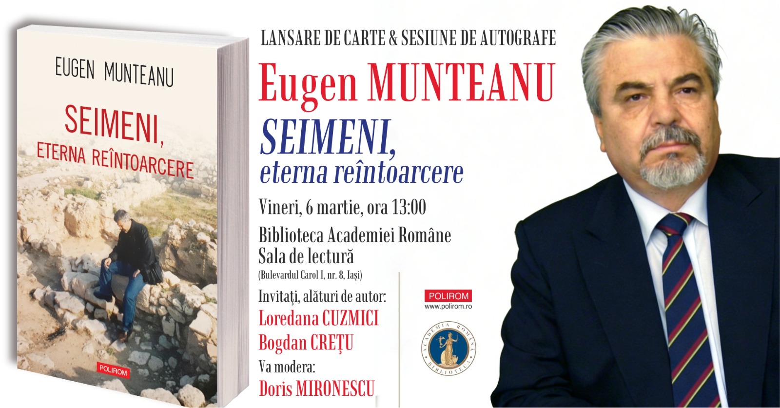 Pe 6 martie 2026, de la ora 13.00, va avea loc lansarea volumului „Seimeni, eterna reîntoarcere”, scris de Eugen Munteanu, profesor de lingvistică și filologie românească la Universitatea „Alexandru Ioan Cuza” din Iași. Evenimentul se va desfășura în sala de lectură a Bibliotecii Academiei Române din Iași, unde autorul va fi însoțit de Loredana Cuzmici și Bogdan Crețu, discuția fiind moderată de Doris Mironescu.