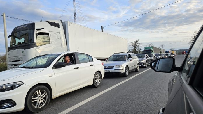 Traficul este semnificativ îngreunat încă din afara localității Sculeni, unde autoturismele sunt nevoite să circule alternativ pe o singură bandă, din cauza numărului mare de vehicule staționate. Dincolo de TIR-uri, aproximativ 50 de mașini mici se află blocate la rând.